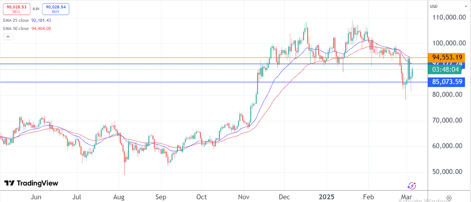 No curto prazo, os touros podem enfrentar resistência na EMA de 25 dias em US$ 92.177. Isso pode levar a um movimento lateral, com suporte em US$ 85.073. Caso haja uma recuperação mais forte, o próximo alvo está em US$ 94.553.