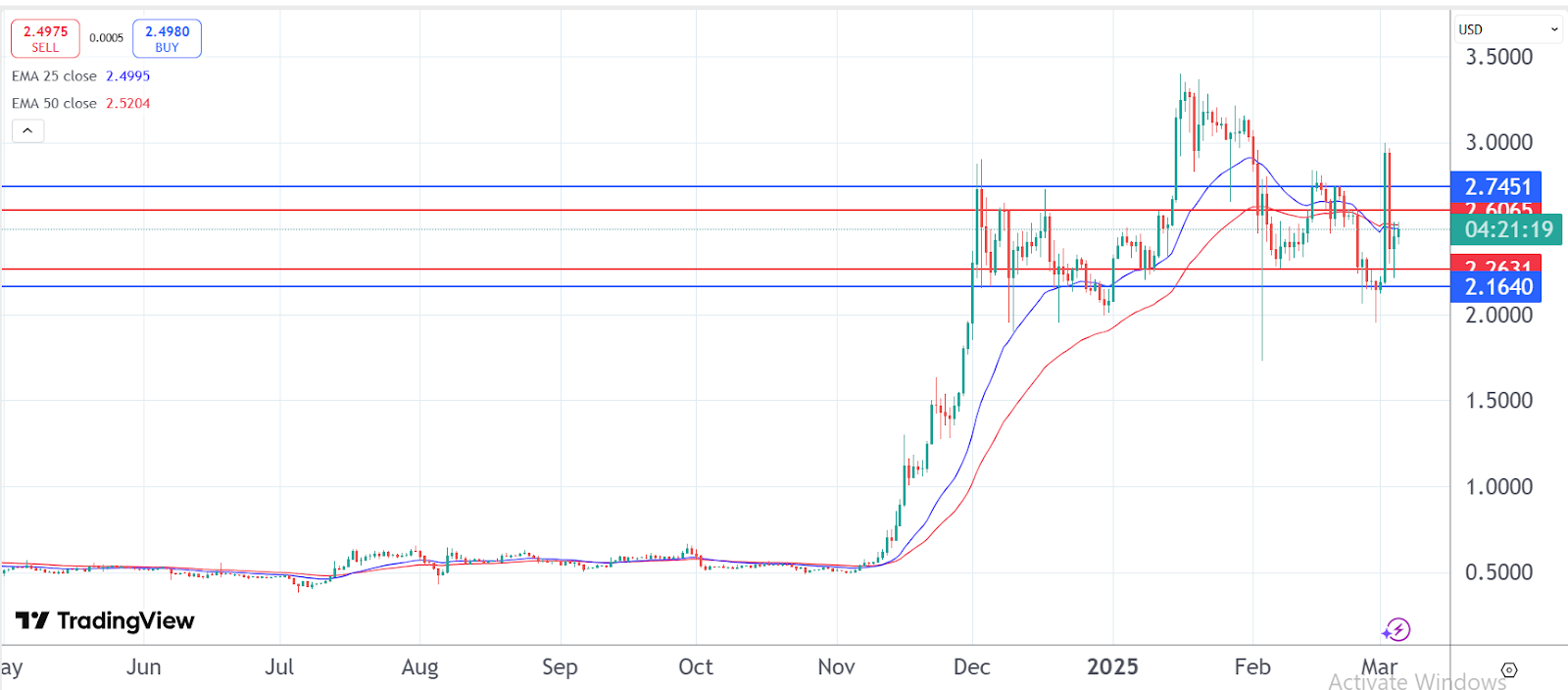 No gráfico diário, a Ripple está sendo negociada entre as EMAs de 25 e 50 dias. No curto prazo, vale observar a faixa entre US$ 2,2631 e US$ 2,6065. Caso continue subindo, pode encontrar resistência em US$ 2,7450. No entanto, um recuo abaixo do suporte de US$ 2,1640 invalidaria essa perspectiva de alta.