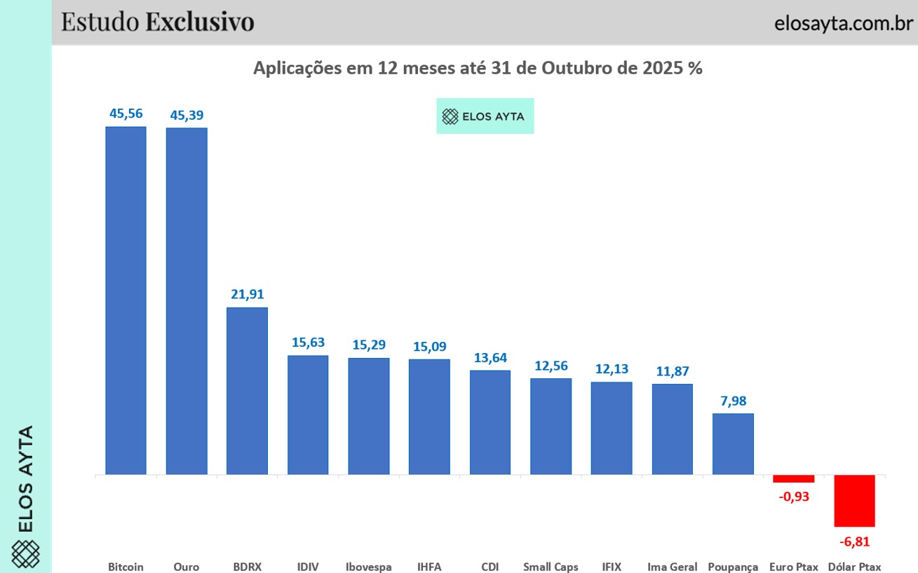 Na comparação de 12 meses até outubro, bitcoin (+45,56%) e ouro (+45,39%) dividem a liderança, reforçando a força dos ativos alternativos. O BDRX vem logo atrás, com 21,91%, seguido de IDIV (+15,63%) e Ibovespa (+15,29%).