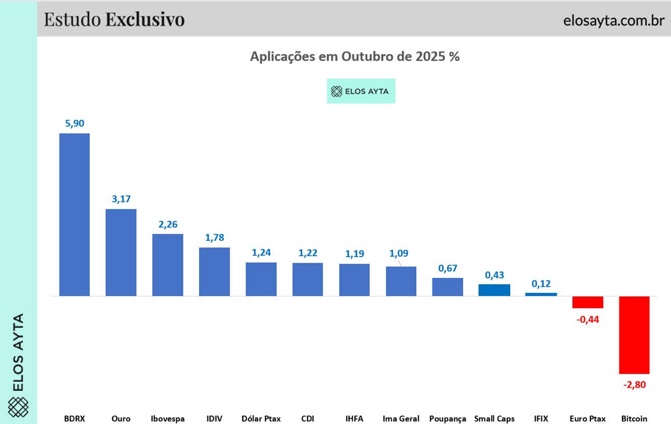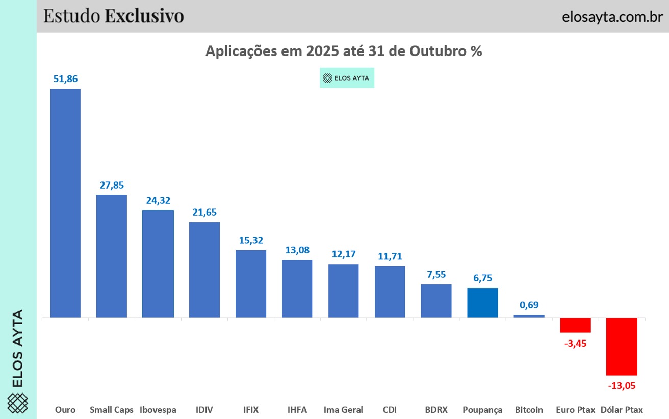 No acumulado de 2025 até outubro, o ouro mantém ampla liderança, com alta de 51,86%, consolidando-se como o ativo de maior rentabilidade do ano, ainda segundo a Elos.